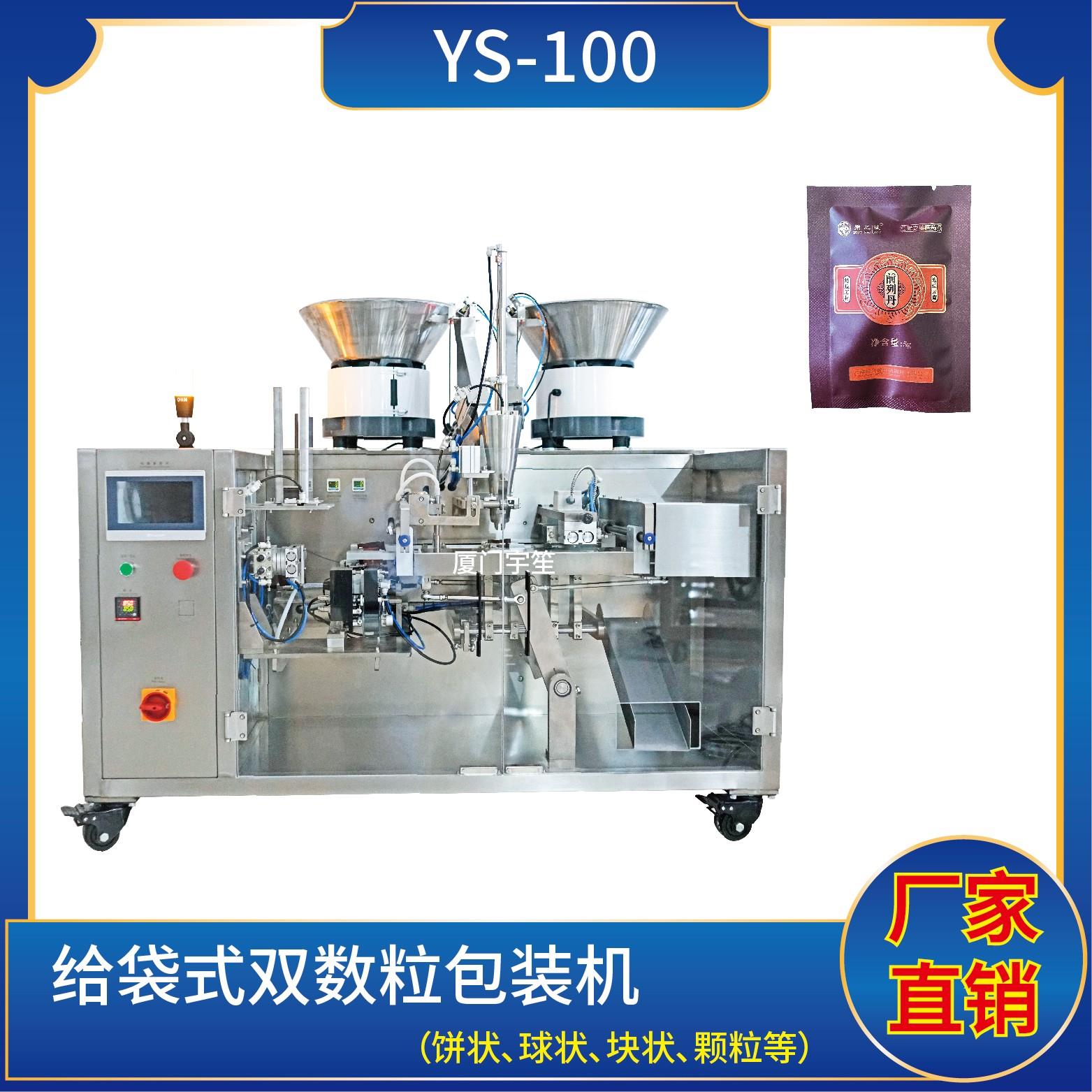 YS-SP100SL 雙數(shù)粒給袋式包裝機特 點1、適用于食品、醫(yī)藥、化工、化妝品行業(yè)中顆粒、餅狀、塊狀、球狀等物品的計量包裝。2、包裝流程全自動、無需人工操作??筛鶕?jù)充填物料的性質(zhì)選配不同的下料結(jié)構(gòu)。3、觸摸屏操作,PLC 控制,驅(qū)動步進電機控制袋長,性能穩(wěn)定、調(diào)整方便、檢測準確。智能式溫控儀,PID調(diào)節(jié),保證將溫度的…